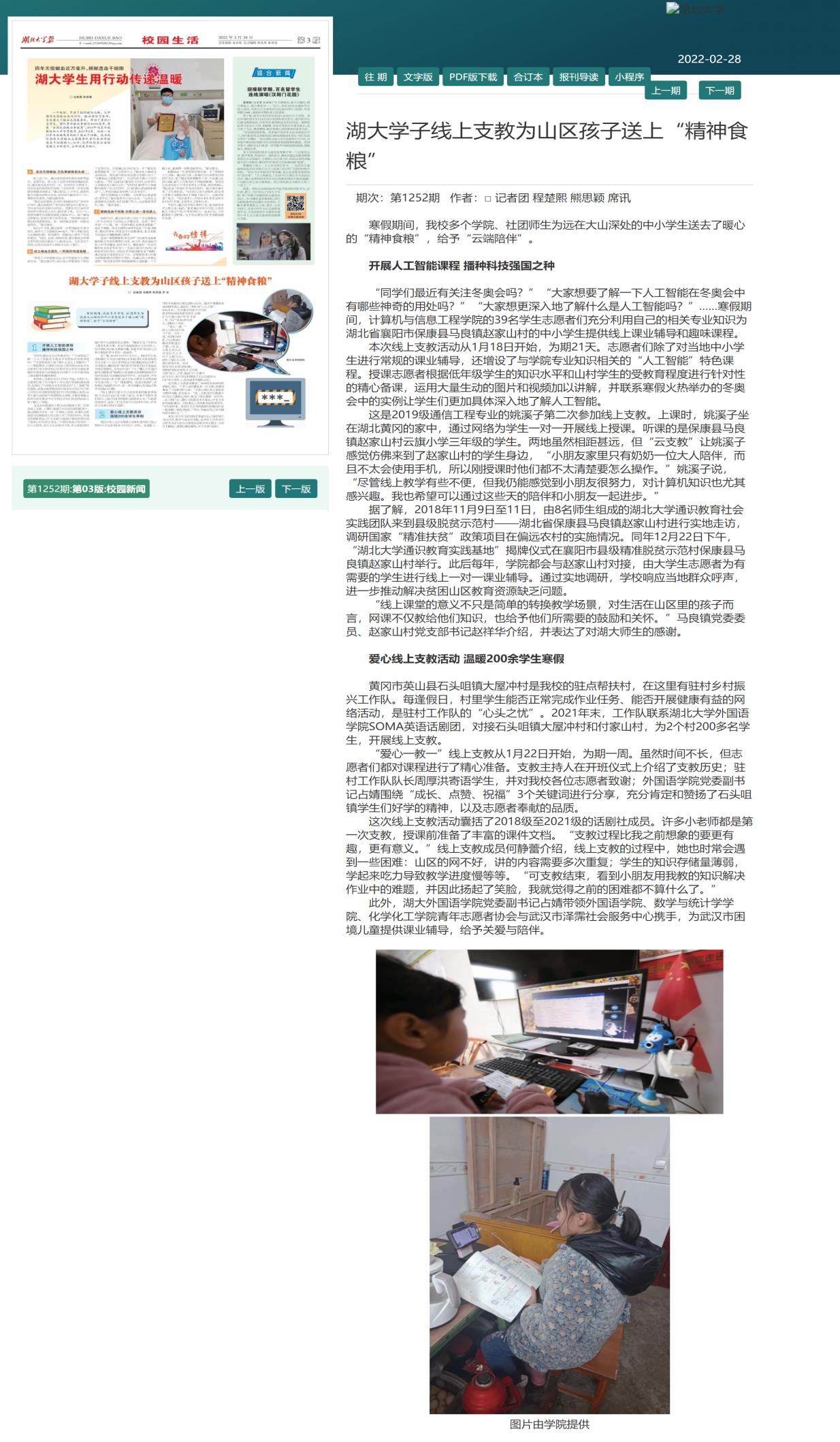 “同学们最近有关注冬奥会吗?”“大家想要了解一下人工智能在冬奥会中有哪些神奇的用处吗?”“大家想更深入的去了解什么是人工智能吗?”……寒假期间计算机与信息工程学院的39名学生志愿者们充分利用自己的相关专业知识为湖北省襄阳市保康县马良镇赵家山村的中小学生送去线上课业辅导和趣味课程。