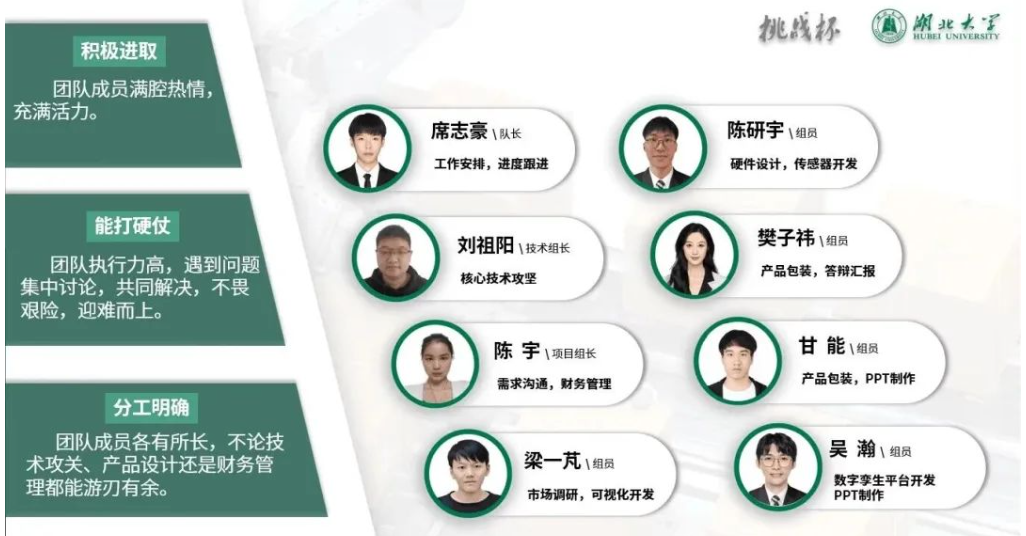 队长席志豪感言到:“‘挑战杯’对于我们这样的新生项目来讲还是有很大难度的。首先,项目的底蕴十分重要,而且不仅项目要好,酒香也怕巷子深,申报书内容也很重要,如果在表达方面做不好,也很难入围。总之,‘挑战杯’真的很锻炼人,不论是技术层面还是心智层面,这次比赛让我们小队整体都有了很大的提升。比赛期间大家都从平时时断时续的学习状态变成了那种时刻准备攻坚的状态。”