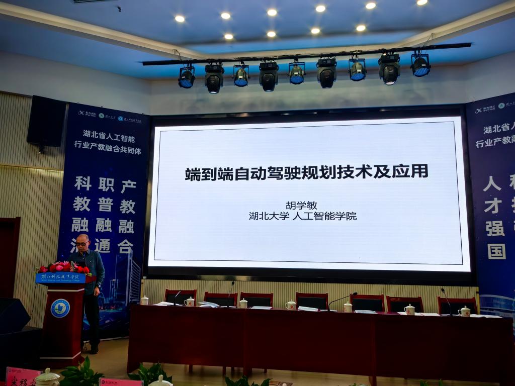 会议同期,科大讯飞股份有限公司机器人业务线咨询总监丁晓磊先以“共同体建设思路”为主题作分享,随后英国365集团公司胡学敏教授作了《端到端自动驾驶规划技术及应用》技术报告,湖北科技职业学院电信工程学院院长涂家海最后以《湖北省人工智能行业产教融合共同体建设的思考与展望》精彩结尾,参会代表一致好评、掌声连连。