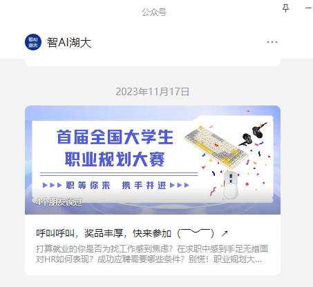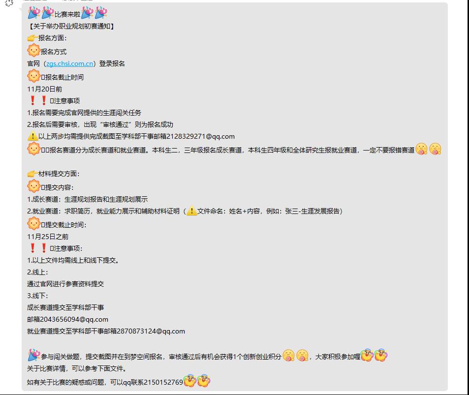 学院通过微信公众号、班级QQ群、微信群广泛宣传“全国大学生首届职业规划大赛”相关情况,从参赛优势、对个人成长帮助、对今后就业发展益处等方面开展介绍,同时增设奖品,动员学生积极参赛报名。下附活动宣传图片。