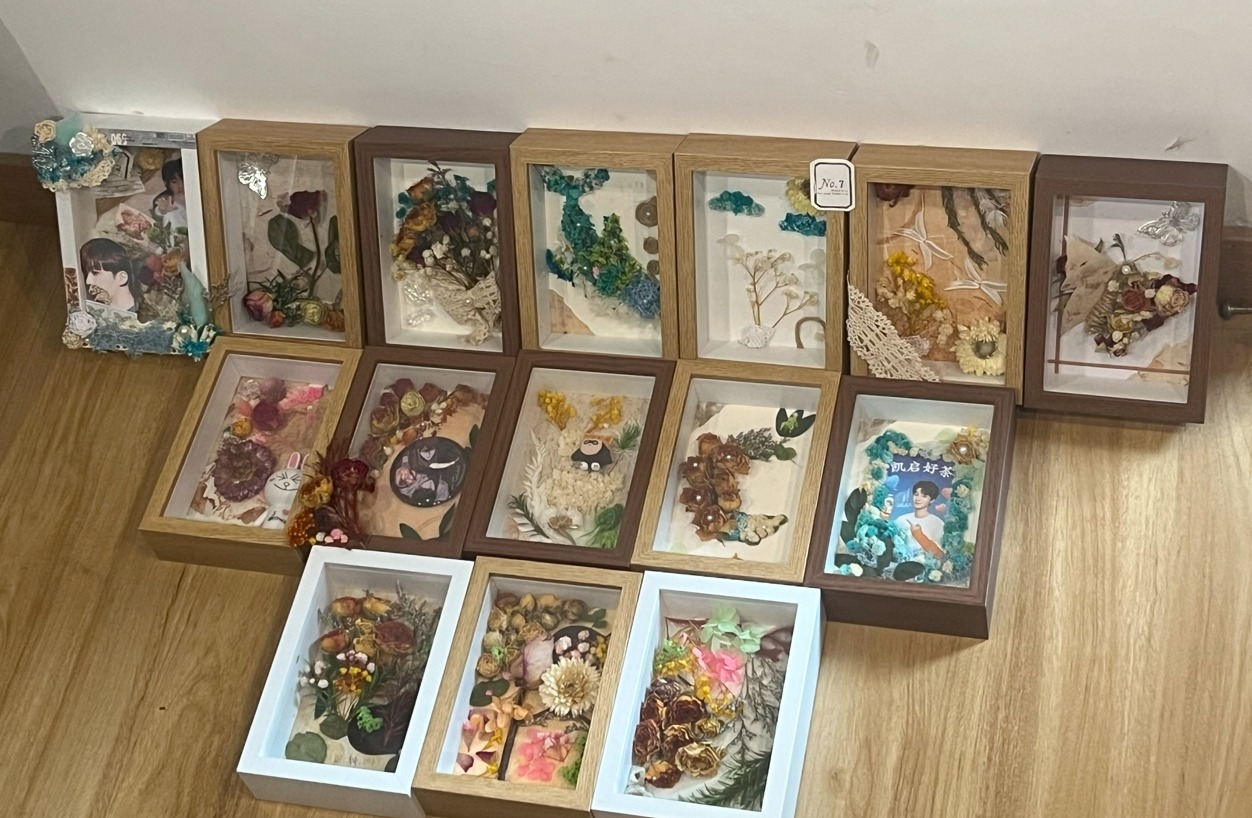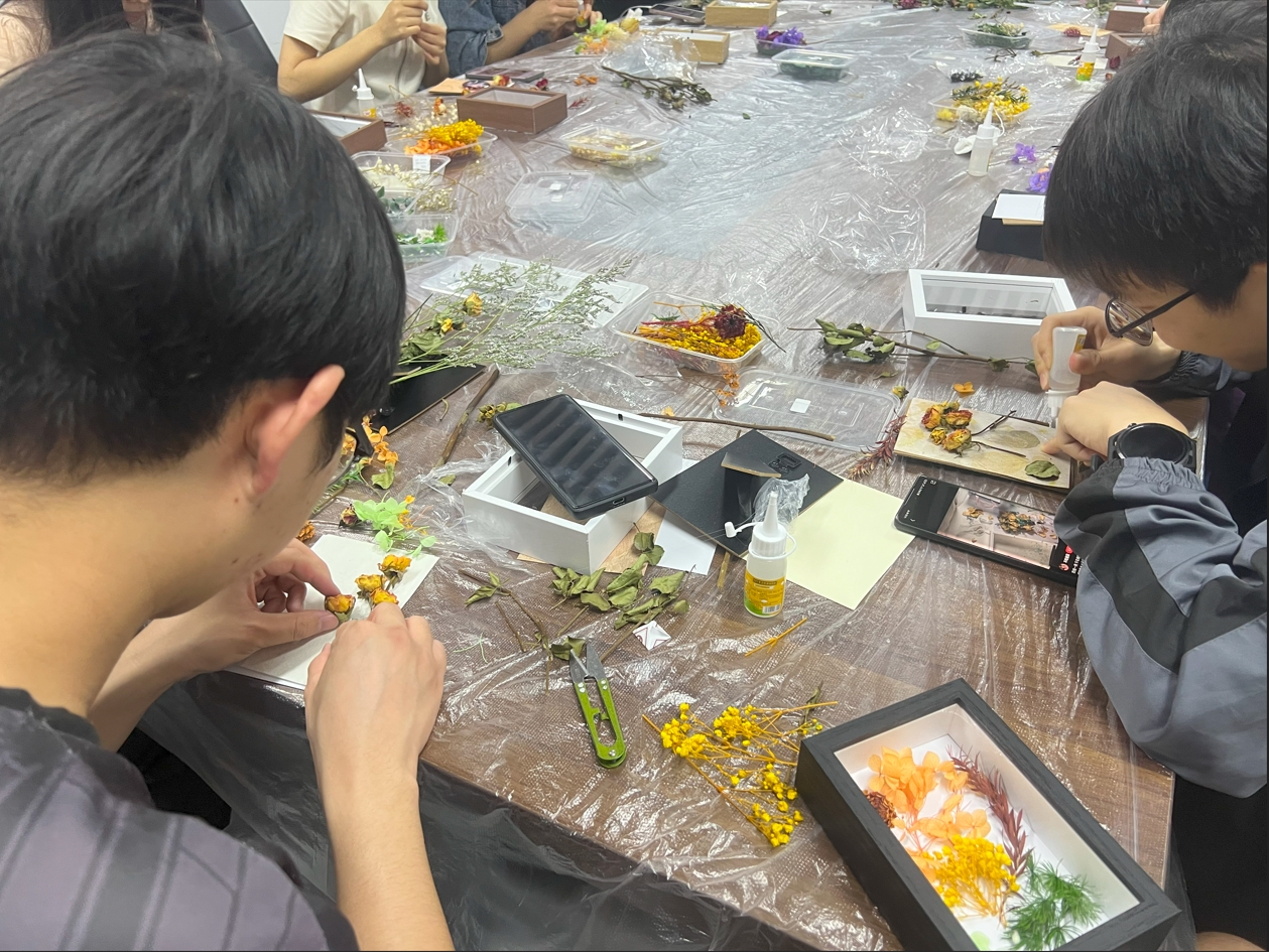 活动中,同学们充分发挥个人的创意和才智,用干花自由组合,拼创出各式各样、丰富多彩的图案。同学们通过即兴发挥、自由创作的途径充分释放自己的压力和情绪。