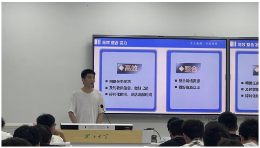 活动伊始,靳氏豪以“从迷茫到坚定”为主线,回顾了自己大学四年的成长历程。作为学生工作的骨干,他生动分享了自己从班级团支书逐步成长为校团委副书记的进阶之路,用亲身经历强调了“平衡与规划”在大学生活中的重要性。他鼓励学弟学妹们积极通过学科竞赛、志愿服务和社会实践等多元渠道拓展视野,并总结出“高效、整合、发力”三个关键词,为低年级同学的学习与生活提供了总的方法论指引。他特别建议同学们“尽早明确目标,在学业、实践、竞赛中多线尝试,为未来发展积累更多筹码”。