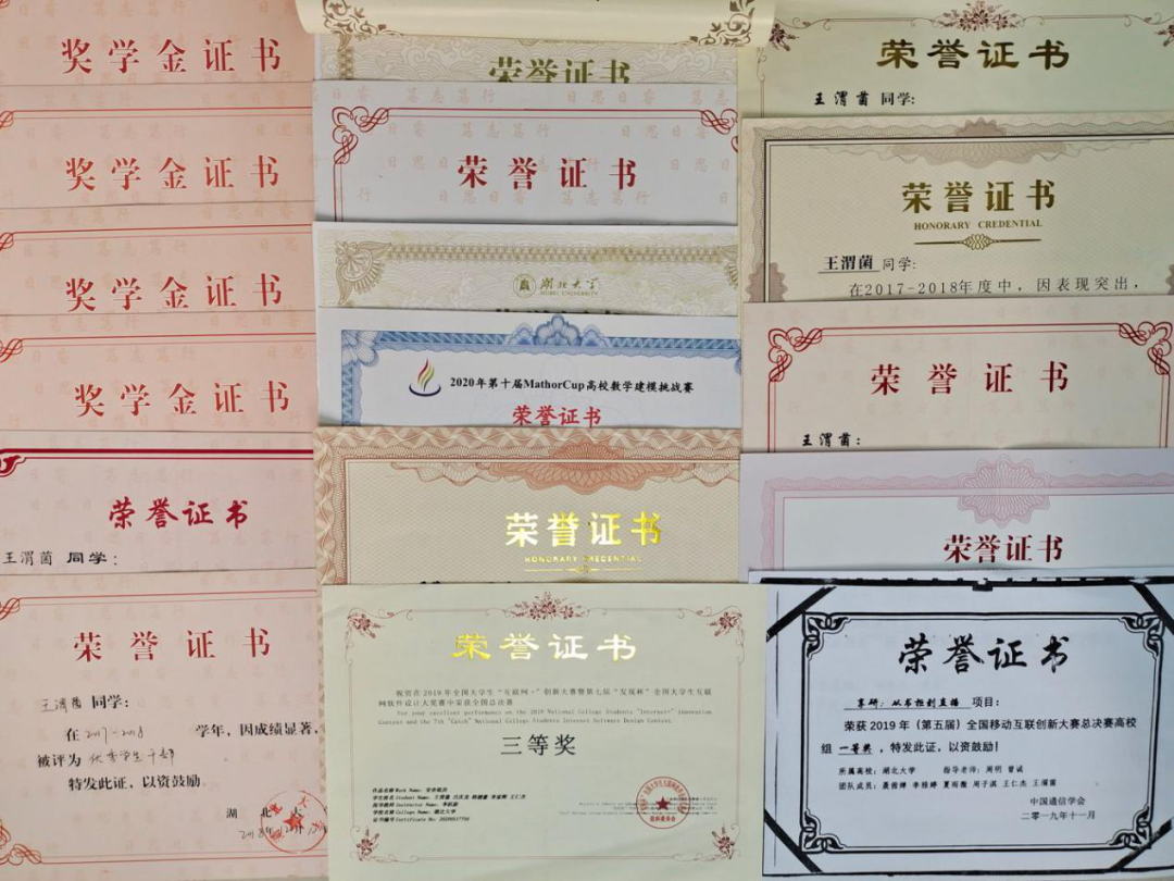 此外,她也经常参加创新创业类竞赛,包括互联网+以及大创。通过积极参与科研竞赛,发现自己的兴趣、找到未来的方向。对于竞赛,她当做一个课外体验的拓展活动来做,正是立足当下,胜固可喜,败亦欣然的态度使她和团队取得了优异成绩:亚太建模、Mathorcup数学建模等多项数学建模竞赛奖项、软件开发类比赛移动互联创新全国一等奖、“发现杯”全国大学生互联网软件设计大奖赛三等奖、“我梦见——楚天创客”比赛优秀创意奖、“挑战杯”湖北省大学生创业计划竞赛铜奖、演讲比赛三等奖、湖北省新闻传播教育创新实践技能竞赛媒体融合类一等奖、第四届中国数据新闻大赛全国一等奖、征文活动优秀文章奖等一系列荣誉奖项。